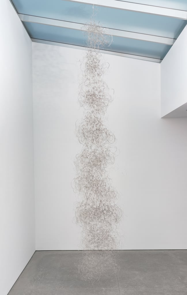 Two To Ten Rising (2025), the artist’s most recent work, is given marquee billing—and it is a beauty. Under a skylight, situated alone against a white wall lit by an uncanny glow, the approximately 19-foot cascade of delicate steel wire appears to be mist from a distance. The work, however, was generated by “Number Stuff”—a system of numeric logic Saret devised to translate mathematical sequences into physical form. Whether inspired by art, science, math or mantras, there is poetry of all kinds here to bewitch you.