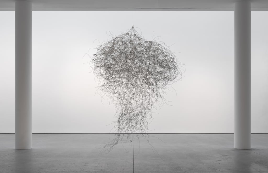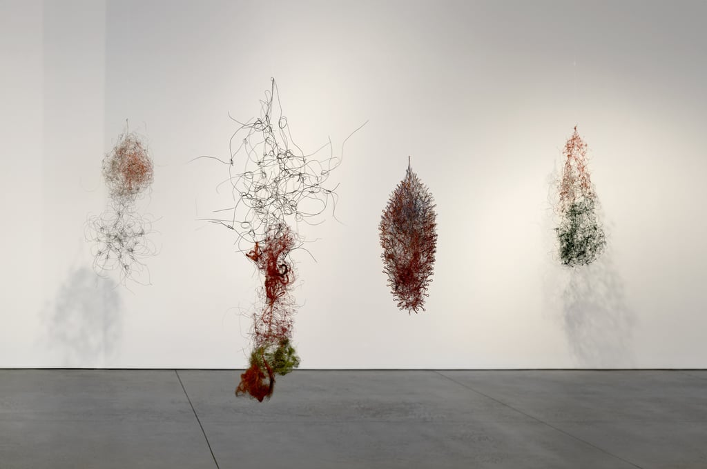 Afloat in space as if in thrall to interplanetary forces, suspended by (nearly) invisible filaments, the nineteen wire sculptures that comprise the exhibition Galacticonexus inevitably prompt thoughts about cosmic systems, a comparison encouraged by its star-trekking portmanteau title. The installation enhances that simulation, pulling us almost physically into what feels like a gravitational field of mini-worlds held in position by unseen forces. These intermittently glittering, intricately woven and twisted configurations have also been likened to tumbleweed and other more earthbound phenomena—from biodiverse botanicals to the human body. Such associations, however, are provisional, countered by the work’s insistent materiality.